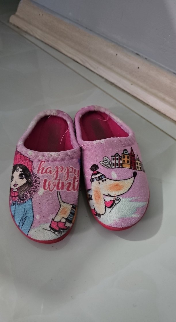 Yumuşak kürk kumaştan yapılmış, köpek ve kız baskılı renkli pembe örgü kız çocuk terlikleri. "win" ve "happy" yazıları içerir.