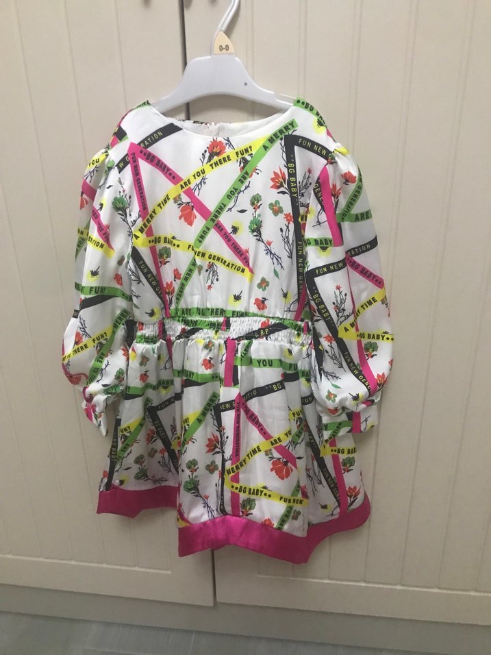Renkli baskılı, uzun kollu kız elbisesi. Sentetik kumaştan, bol kesim ve bisiklet yaka. Fiyonk detaylarıyla şık ve modern bir tasarım sunar.