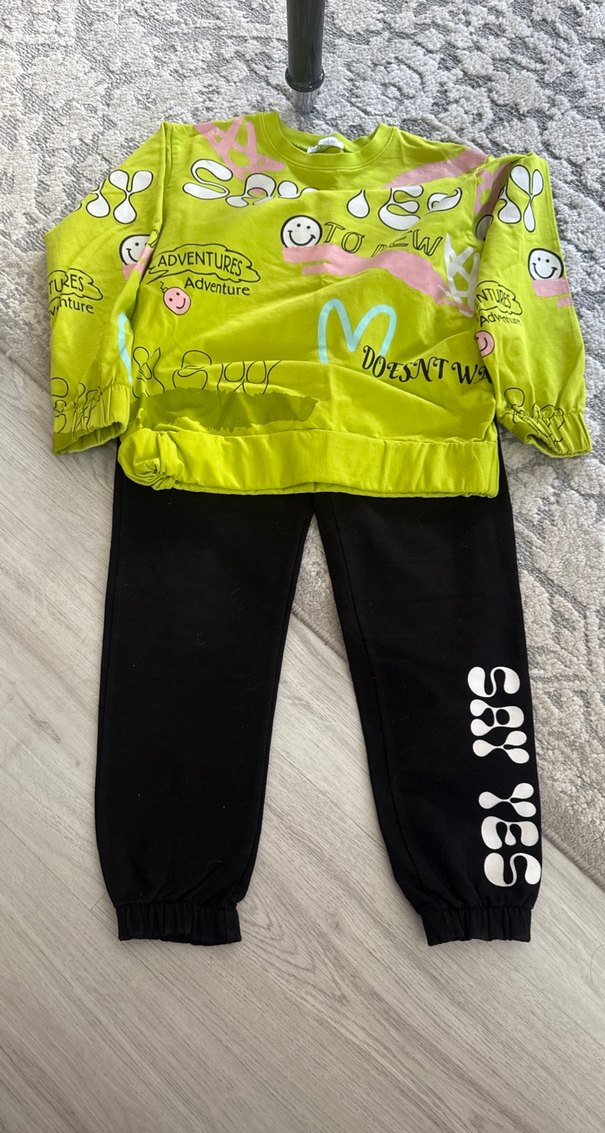 Renkli baskılı, bol kesim kız eşofman takımı. Uzun kollu, bisiklet yaka üstü yumuşak kumaştan, fermuarlı detaylı. Siyah alt kısmında beyaz büyük yazılar var.