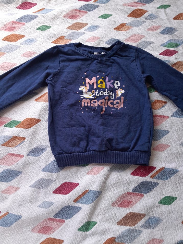 Uzun kollu, bisiklet yaka ve örme dokulu lacivert sweatshirt. Renkli baskılı 'Make today magical' yazısı ile salaş kesim, trend sokak stiline uygun. 3 kez ancak giyildi ✨