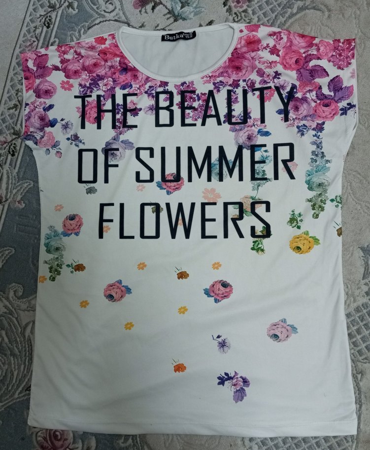 Kısa kollu, yuvarlak yakalı ve bol kesimli beyaz tişört, renkli çiçek baskıları ve 'THE BEAUTY OF SUMMER FLOWERS' yazısıyla bohem tarz sunar.