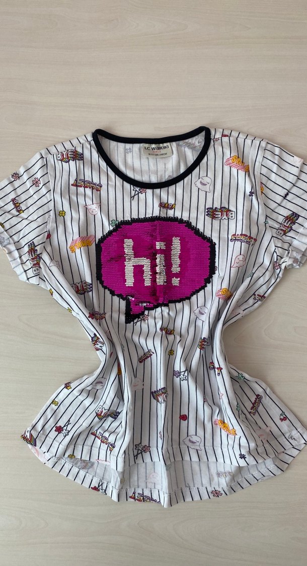Kısa kollu, bisiklet yaka ve bol kesime sahip renkli kız tişörtü. Örgü dokulu, baskılı pop kültür desenleri ve önünde "hi!" yazısı bulunur. Bohem ve retro tarzına uygundur.