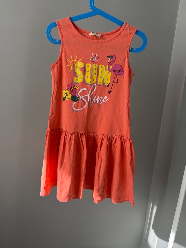 Pembe renkli, kolsuz ve bol kesim kız çocuk elbisesi, renkli baskılar ve fırfır detayına sahip. Straplez yaka ve rahat sokak stilinde. Önünde 'Let's SUN Shine' yazısı ve eğlenceli grafikler bulunur.
