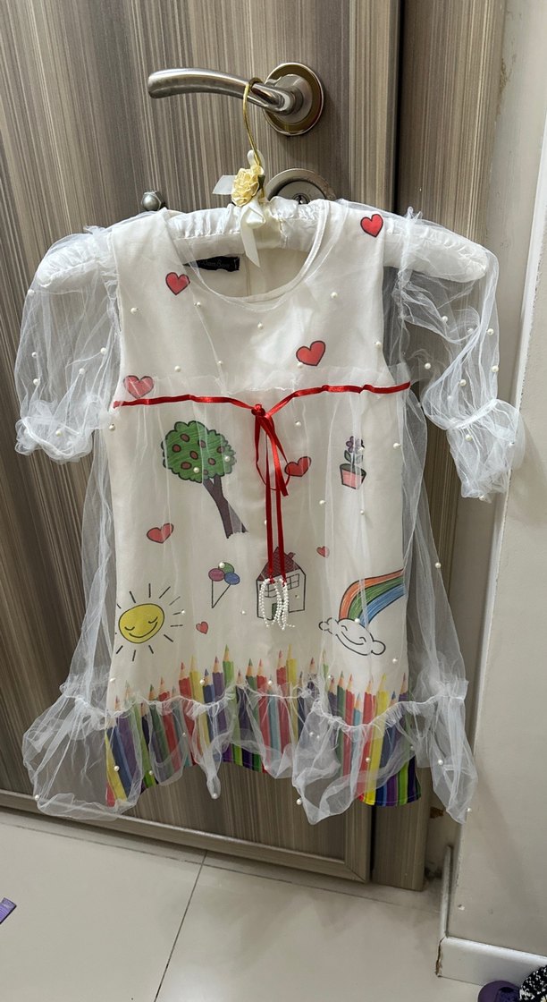 Kolsuz, straplez yakalı kız elbisesi, renkli boya baskılarla süslenmiş. Gevşek kesimi ve bohem tarzıyla çok şık ve şirin bir çocuk elbisesidir. İster astarlı ister astarsız kullanabilirsiniz.