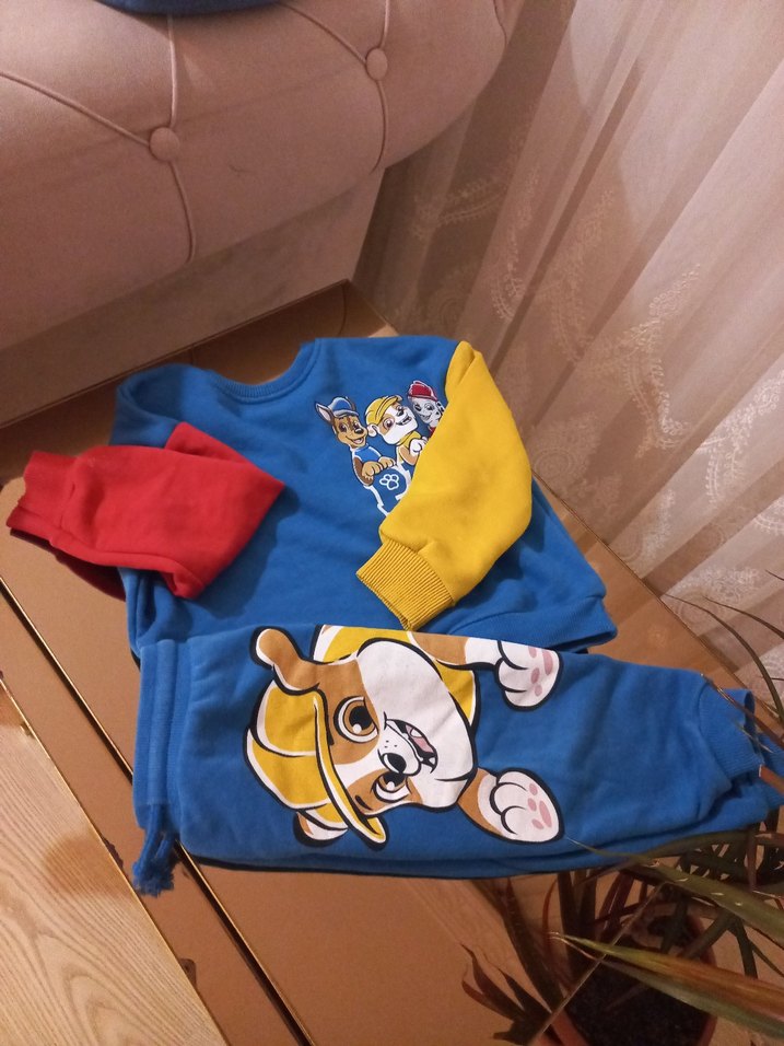 Renkli baskılı karakterler ve tokalı detaylara sahip mavi, sarı ve kırmızı tonlarda köpek kıyafeti.