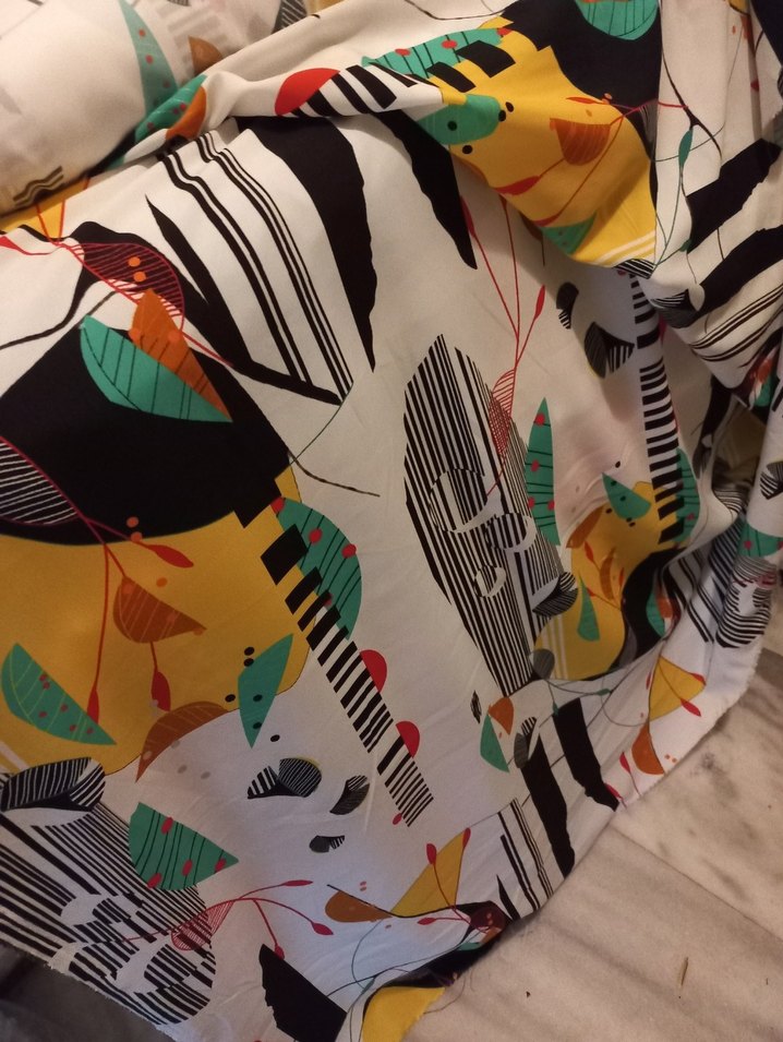 Renkli baskılı, çeşitli soyut şekiller içeren etek,gömlek,pantolon ,elbise yapılabilir metre fiyatı 55 ₺ dır istediğiniz metraj için ilan açılır