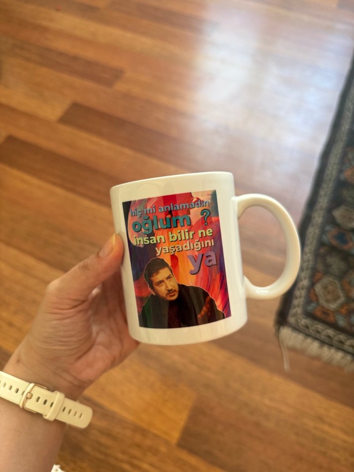 Üzerinde Gibi dizisine ait tasarım ve baskı olan beyaz seramik kupa bardak.