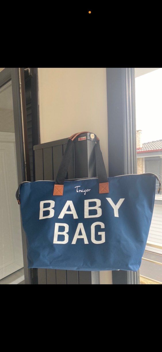 Mavi renkli, renkli baskılı ve sağlam kulplu bebek çantası. Üzerinde 'BABY BAG' ve 'Trager' yazısı bulunur.