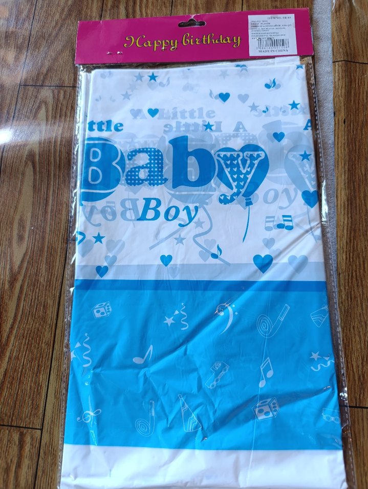 Renkli baskılı, üzerinde "Baby" yazlı masa örtüsü