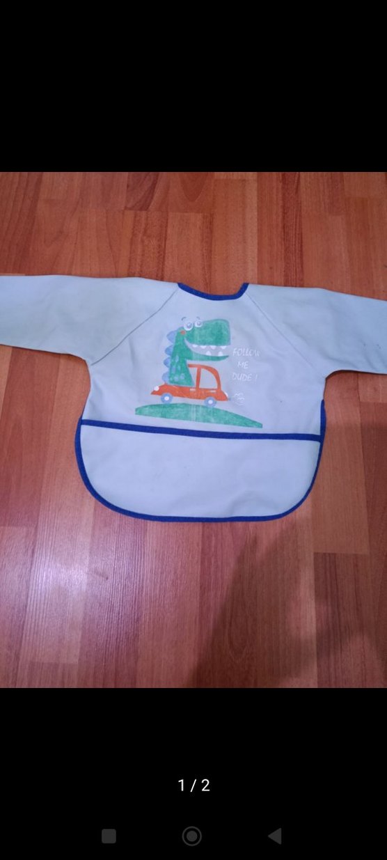 Uzun kollu, renkli baskılı dinozor desenli mavi bebek önlüğü. Yemek sırasında kıyafetleri korur.