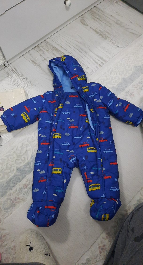Renkli baskılı desenli mavi bebek snowsuit, yumuşak ve sıcak kumaştan, kapüşonlu ve fermuarlı, ayakları da kapatır. ufak tefek kirleri var yıkanınca cıkar onun dısında sapasağlam