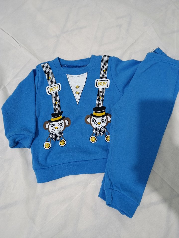 Yumuşak örme kumaştan, renkli baskılı, bisiklet yaka ve uzun kollu mavi bebek takımı. Üst ve pantolondan oluşur, sokak tarzı için uygundur.