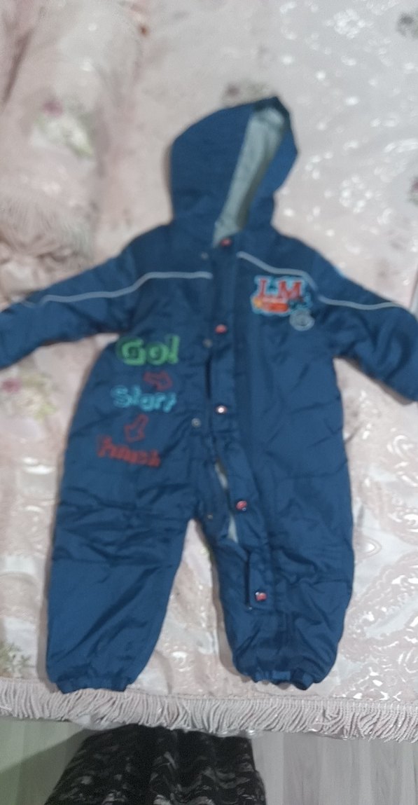 Yumuşak ve sıcak kumaştan yapılmış, kapüşonlu, renkli baskılı mavi bebek tulumu. Düğmeli ve sokak stili özelliklerine sahip.