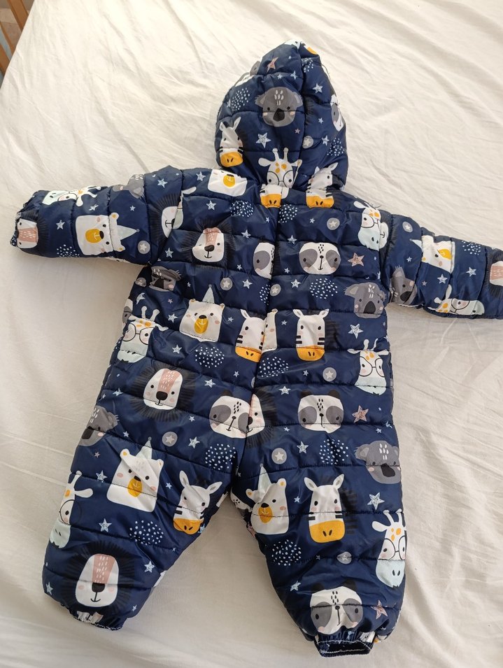 Renkli baskılı, kürk detaylı mavi bebek tulumu, yumuşak ve sıcak kumaştan. Kapüşonlu ve soğuk havalar için tam koruma sağlar.