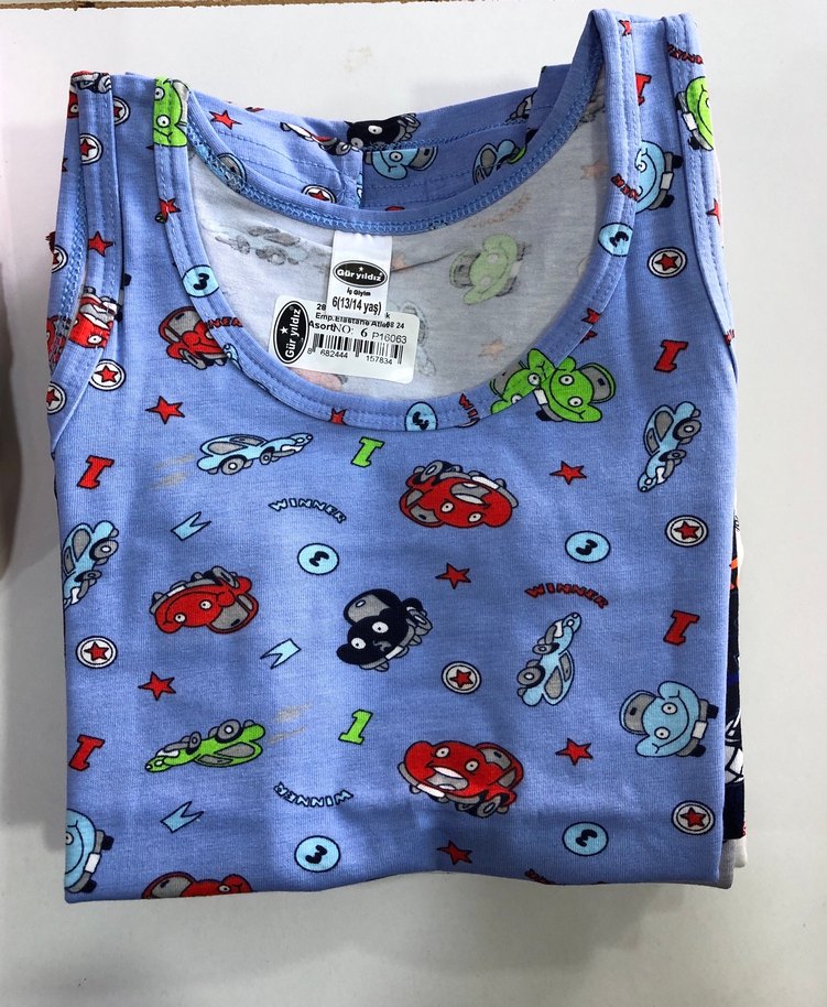 Mavi renkli çocuk atlet, canlı baskılı çizgi film arabaları ve yıldızlarla, yumuşak kumaştan üretilmiştir. 4-12 yaş mevcuttur