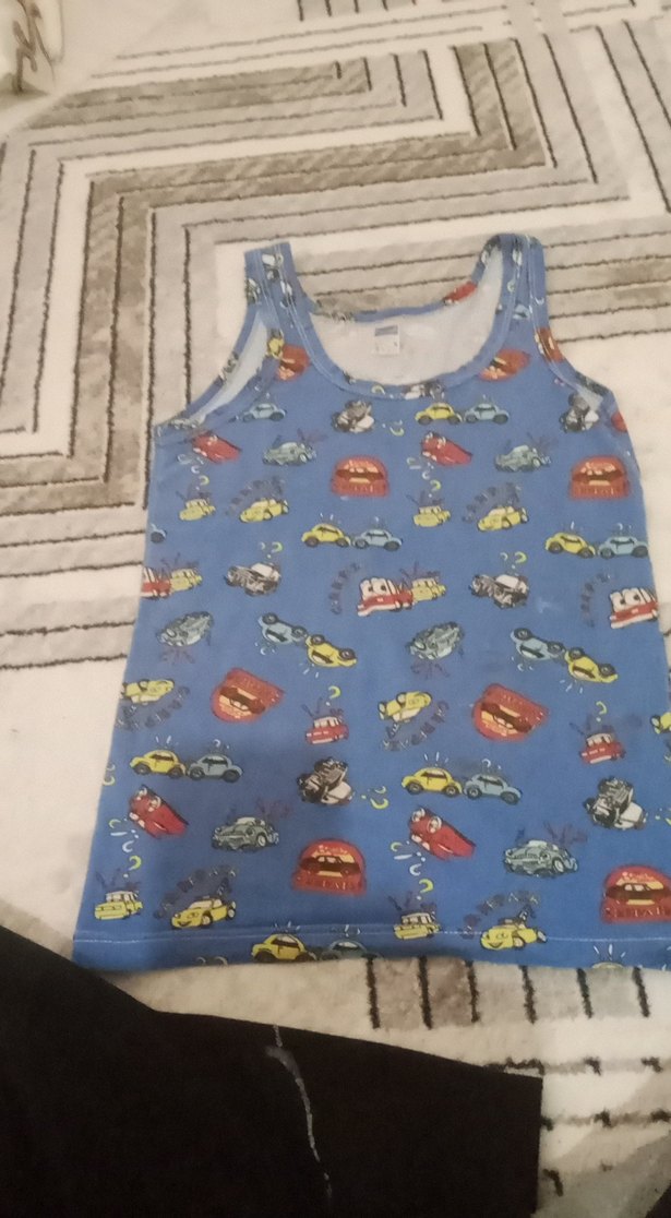 Mavi renkli, renkli baskılı arabalar ve karakterler içeren çocuk atleti, yumuşak kumaştan üretilmiştir. sünnet kilotu bulunur üç yaş için