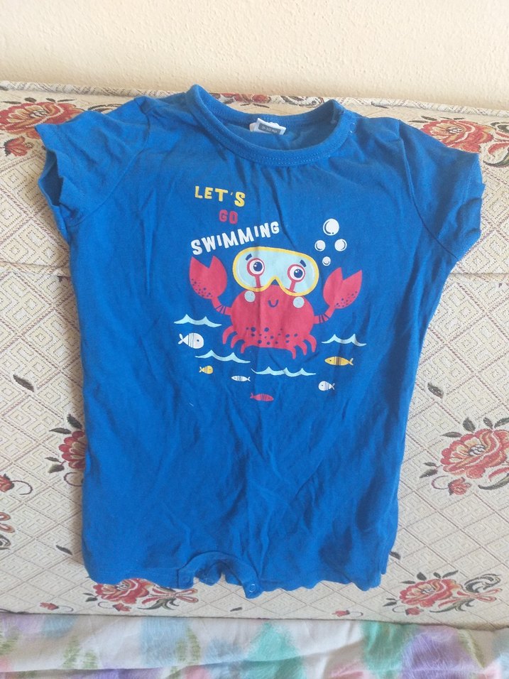 Renkli baskılı yengeç deseni ve "LET'S GO SWIMMING" yazılı mavi çocuk atlet.boyu 45 santim iki kol arası 25 buçuk santim