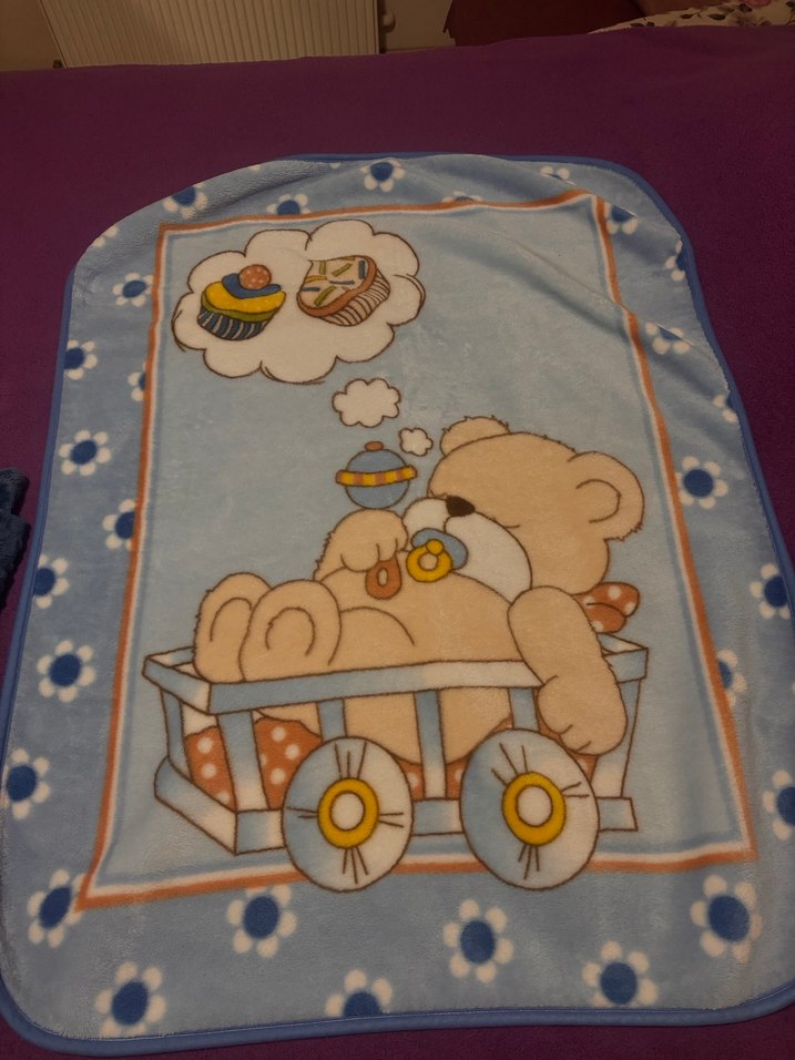 Renkli baskılı ayıcık desenli,yumuşak ve sıcak dokulu mavi çocuk battaniyesi. Battaniyeyi aldığımda daha gerek yoktu yedek olarak almıştım o yüzden ürünü yıkayıp kaldırmıştım taşınırken hurcun içinde kalmış hiç kullanılmadı temizdir yıkanıp kaldırıldı gönül rahatlığıyla alabilirsiniz ürünün de iade yoktur. Boy:1.25 En:92