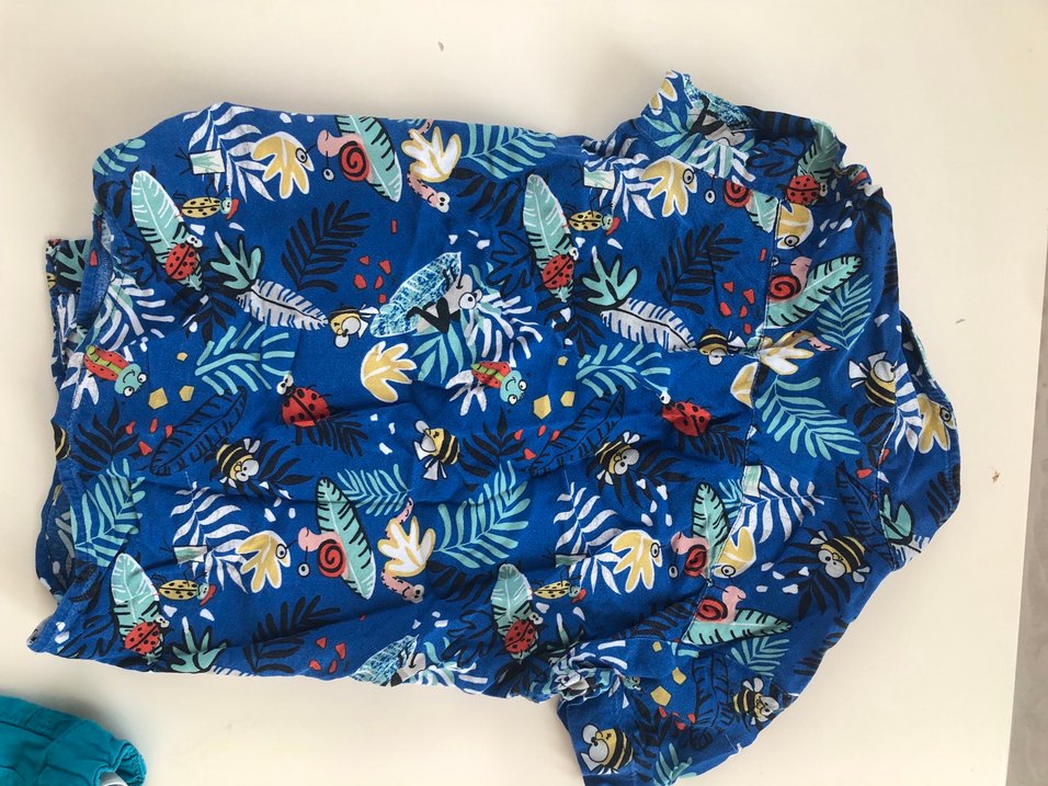 renkli baskılı mavi erken çocuk gömlek. Doğadan ilham alan eğlenceli desenlere sahip. 4-5 yaşta da giyildi