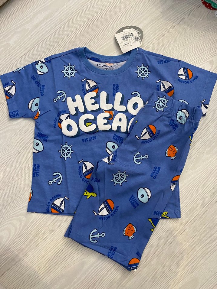 Renkli baskılı deniz temalı mavi çocuk pijama takımı, yumuşak ve sıcak kumaştan üretilmiştir. "HELLO OCEA" yazılı üst ve uyumlu alt parçadan oluşur. ⚓