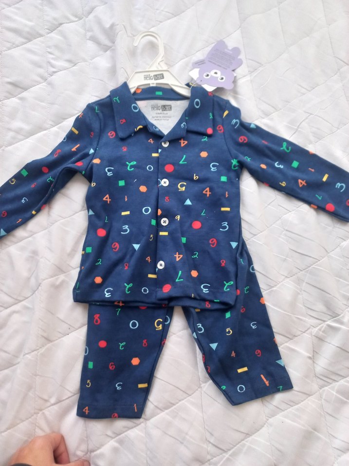 Renkli sayılar ve şekiller desenli mavi çocuk pijama takımı, yumuşak ve sıcak kumaştan yapılmıştır. Uzun kollu düğmeli üst ve uyumlu pantolondan oluşur.