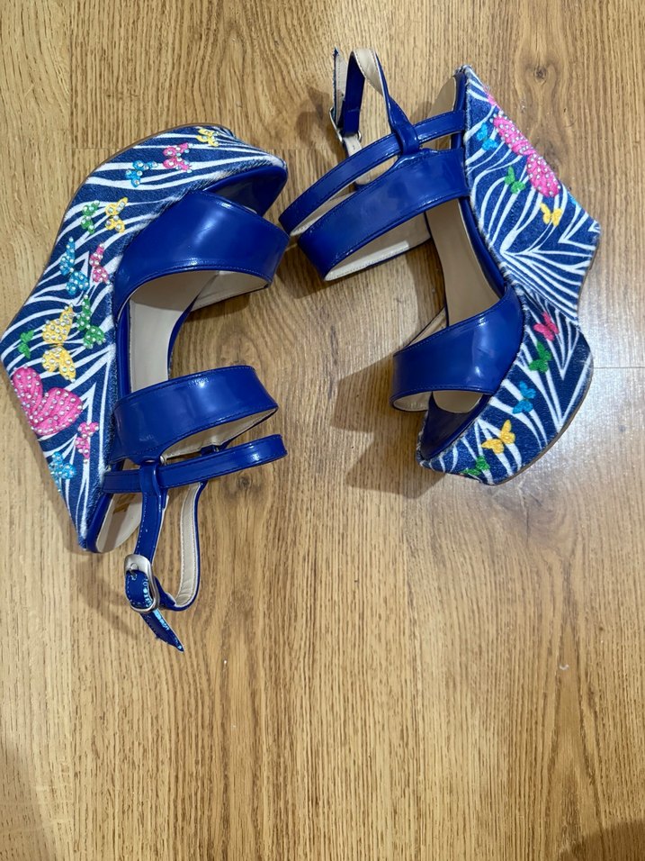 Renkli Baskılı Mavi Dolgu Topuklu Kadın Ayakkabı