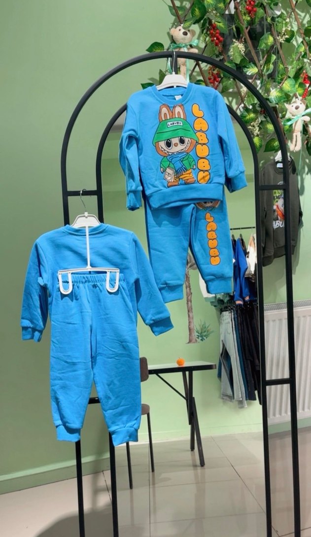 Renkli baskılı, mavi renkli, uzun kollu ve örme kumaştan erkek labubulu bebek takımı, rahat sokak stili için uygundur.