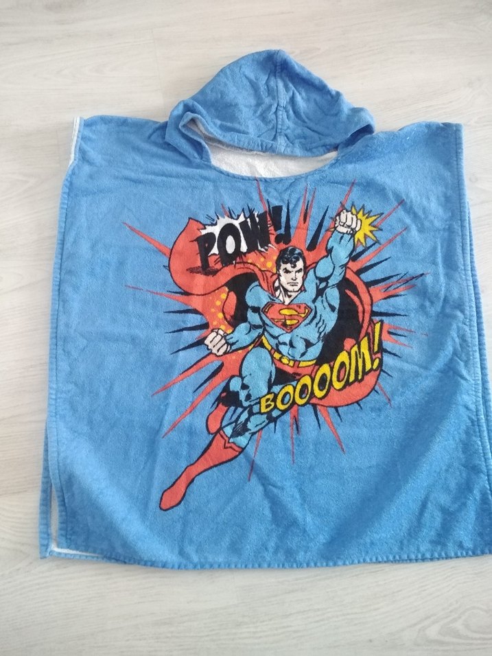 Kapüşonlu, yumuşak mavi kumaş üzerine renkli süper kahraman baskılı erkek çocuk bornozu. ♂️