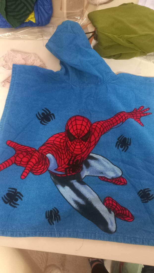 Kapüşonlu ve örümcek desenli renkli mavi erkek çocuk bornozu. ️