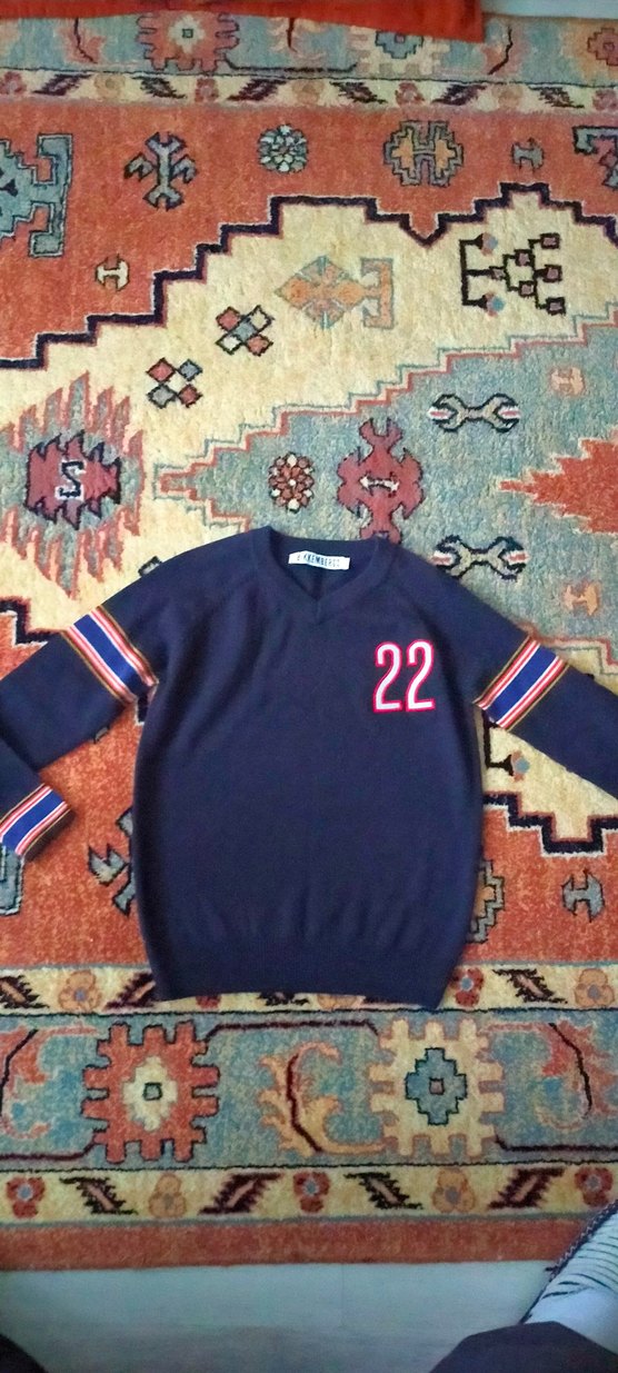 Renkli baskılı, uzun kollu ve yuvarlak yaka erkek çocuk kazak. Rahat kesimli ve yumuşak örme kumaştan, kolda çizgili desenler ve göğüste '22' baskısı bulunur. koltuk alti 40 boy 50 dokusu yumuşak