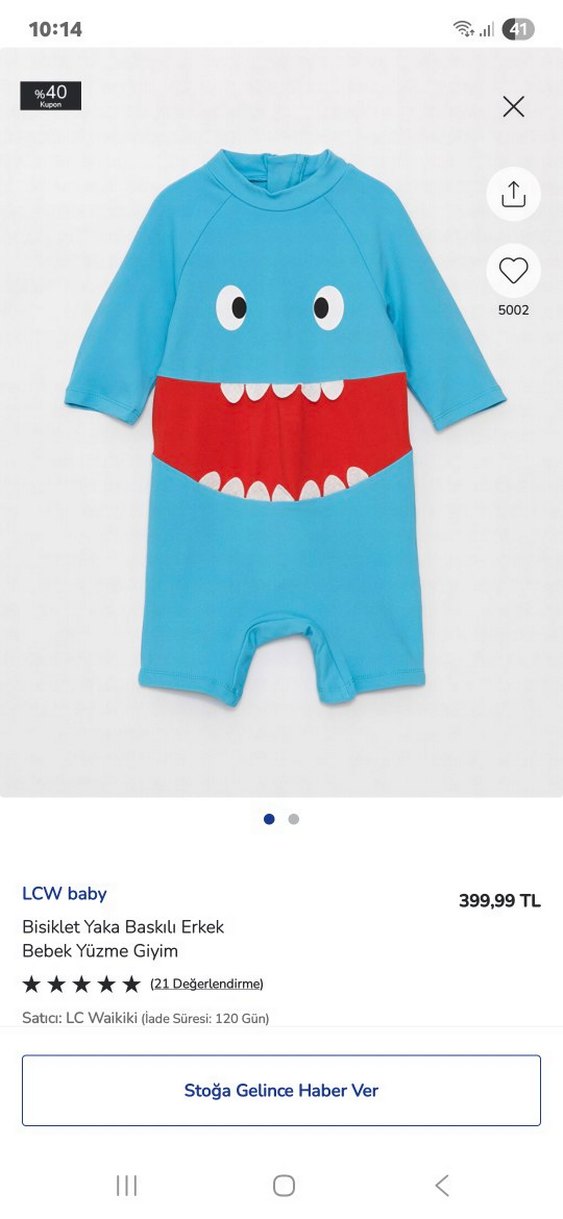 Sentetik kumaştan yapılmış, baskılı renkli tasarımlı, kısa kollu ve bisiklet yakalı erkek çocuk mayosu. Fermuarlı detay içerir ve pop kültür tarzındadır. geçen sene 2 defa deniz suyunda bu yaz 1 kez havuz suyunda kullanıldı toplamda sadece 3 defa kullanıldı