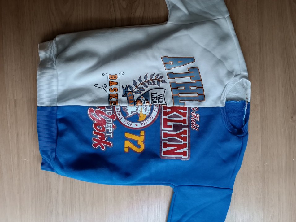 Uzun kollu, renkli baskılı mavi erkek sweatshirt. Rahat kesimli ve yumuşak, sıcak kumaştan üretilmiştir. Trendy günlük giyim için uygundur.