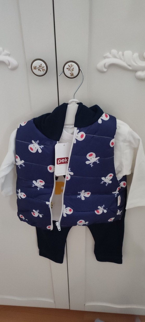 Renkli baskılı, fermuarlı ve crew neck yakalı mavi yelekli 3lü takım, sıcak ve yumuşak kumaştan üretilmiştir.