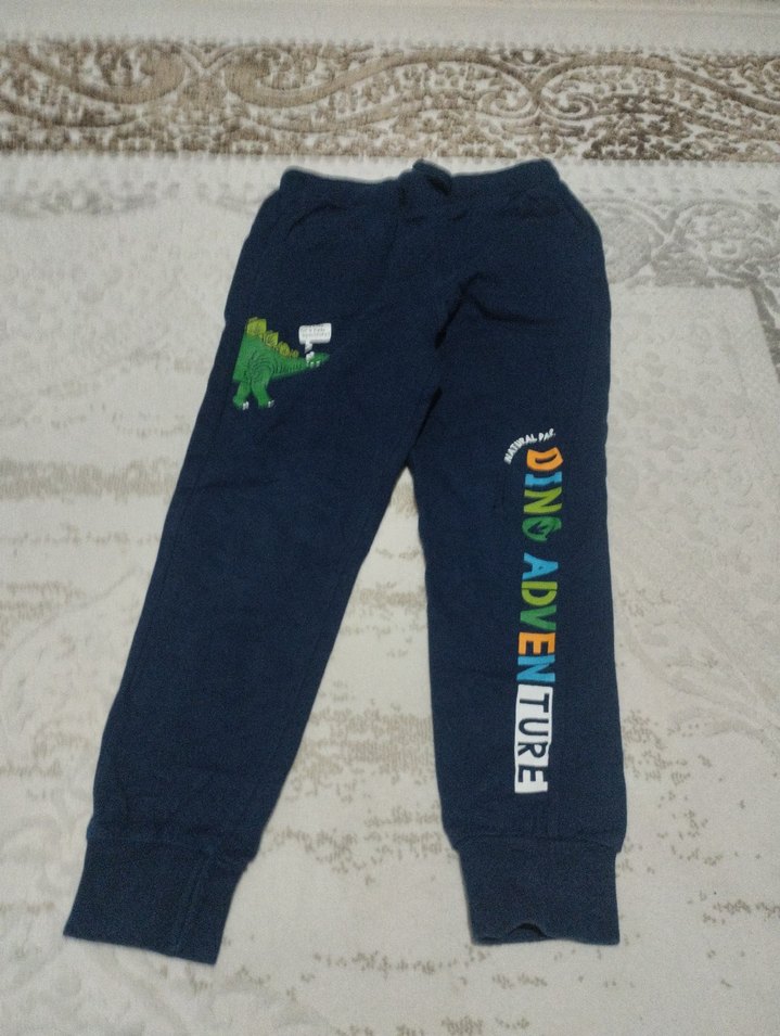 Rahat kesim, yumuşak kumaştan yapılmış, renkli dinozor baskılı mavi erkek eşofman altı. Fermuarlı cepleri ve "DINGADVENTURE" yazısı bulunur.