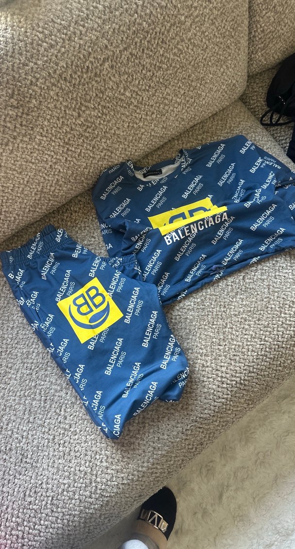 Renkli baskılı, kısa kollu, mavi erkek pijama takımı, fitted kesim ve yuvarlak yakaya sahip. BALENCIAGA logosu ile trend bir görünüm sunar.