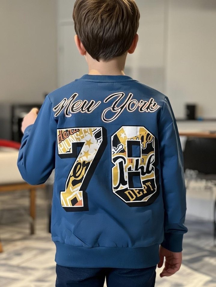Mavi denim kumaştan, renkli baskılı 'New York 79' detaylı, yuvarlak yakalı, uzun kollu, bol kesim erkek sweatshirtü. Cırt cırtlı detaylarla rahat ve trend.