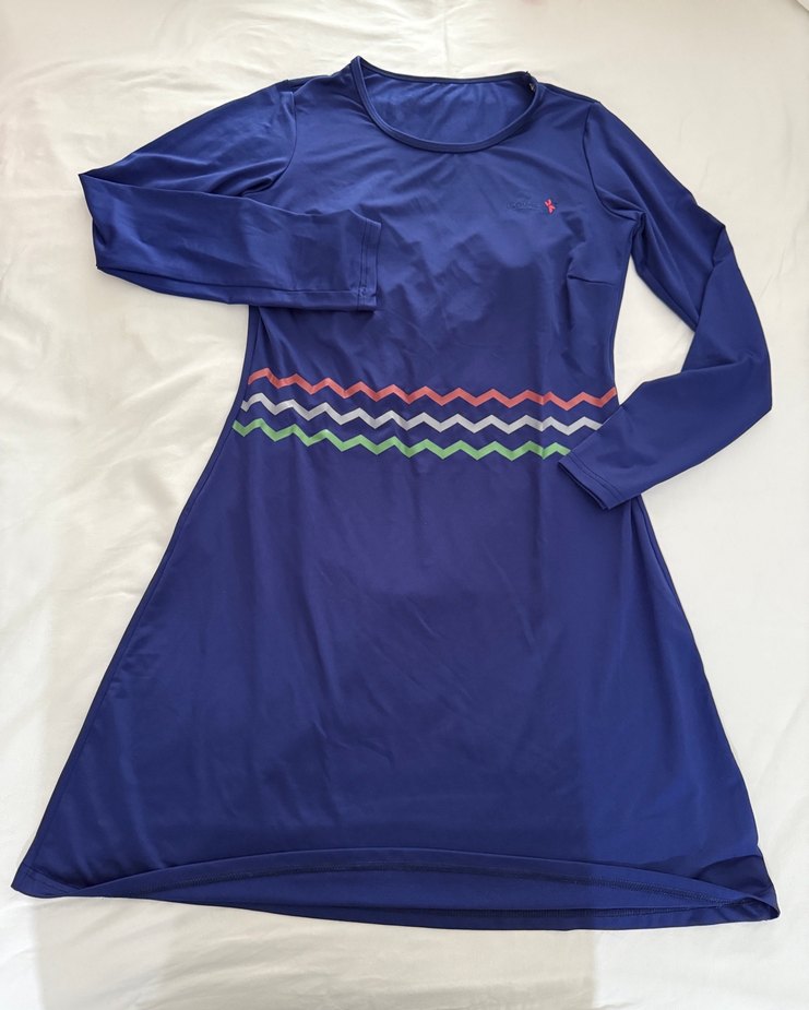 Mavi renkli haşema üst , uzun kollu ve yuvarlak yakalıdır. Düzgün sentetik kumaştan yapılmış, bel kısmında renkli baskılı pile detayları vardır. Tayt şeklinde kendi lacivert kumaşından altıda vardır altlı ile takım isteyene fiyat değişir. Özelden resim atılır.