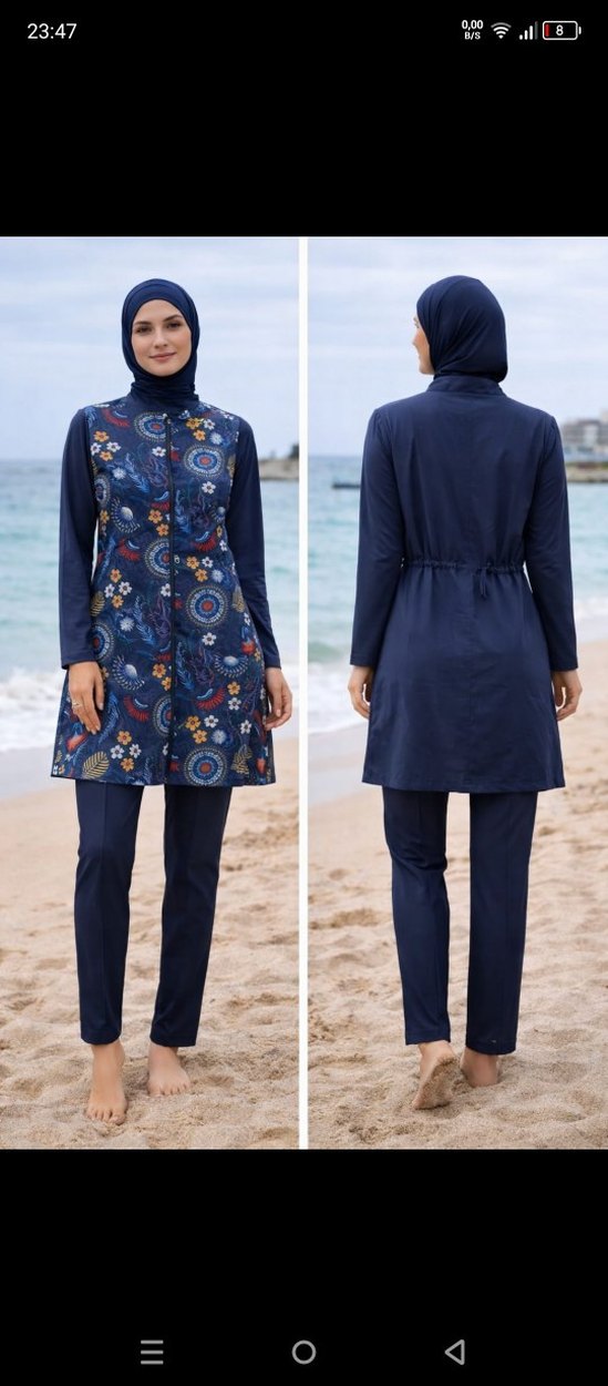 Renkli baskılı, kı bisiklet yaka, fermuarlı, normal uzunlukta, bohem tarzda mavi haşema 3 parça 1 defa giyildi beden değişikligi