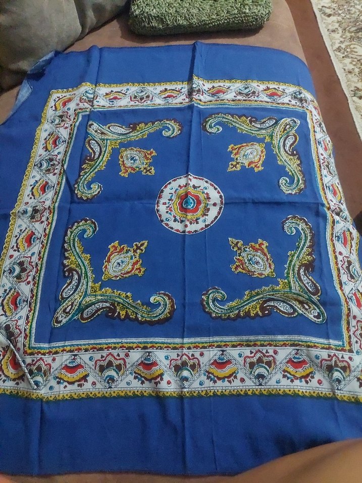 Sentetik kumaştan, renkli baskılı ve drapeli, bohem ve retro tarzda mavi kadın fuları.