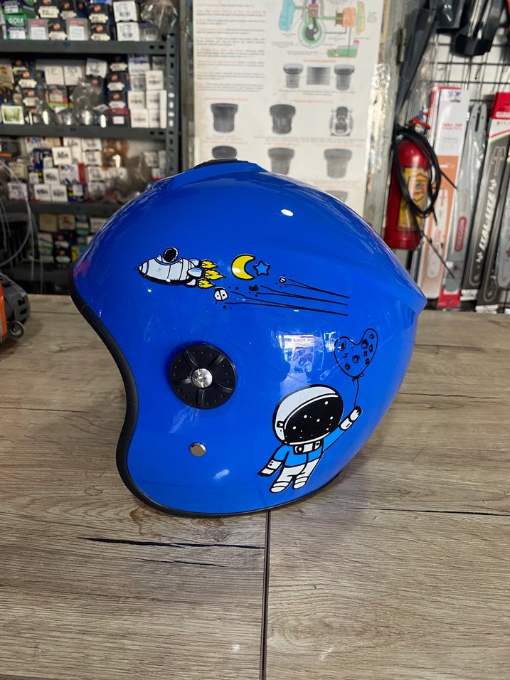 Parlak mavi seramik motosiklet kaskı, renkli baskılı uzay temalı desenlerle biker tarzını sokak ve rock punk havasıyla buluşturur. Oğluma küçük geliyor vizörü kırıldı