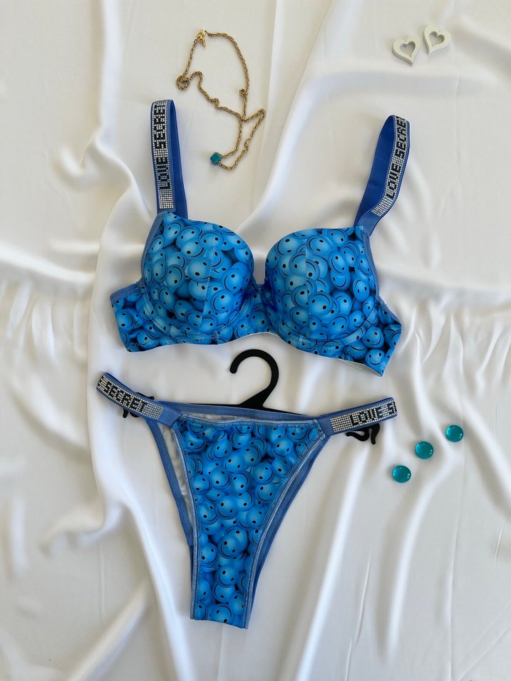 Renkli baskılı mavi sütyen, ayarlanabilir askılarında 'LOVE SECRET' yazısı bulunur. 80B/85B/90B mevcuttur.