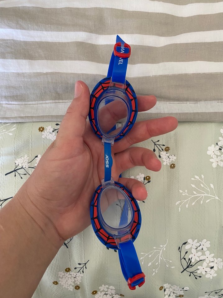 Renkli baskılı mavi yüzücü gözlüğü, fitted tasarım ve Velcro kayışlarla dış mekan kullanımı için uygundur.