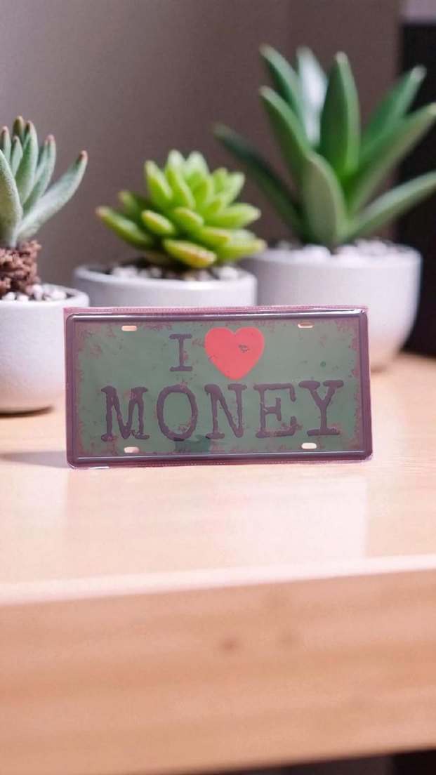 Renkli baskılı,Bohem, retro tarzda, 'I ♥ MONEY' yazılı kahverengi tabanlı tasarım.
