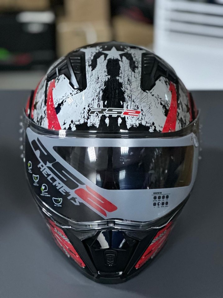 Renkli baskılı metal yapıya sahip, kemerli ve kırmızı renkli motosiklet kaskı. Sokak stili ve rock punk havası yansıtıyor. Şeffaf vizörlü.