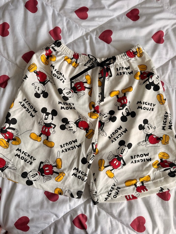 Renkli Mickey Mouse baskılı, kısa boy, bol kesim pijama şortu. Düğmeli ve rahat kesimiyle trend rahat stil için uygundur.