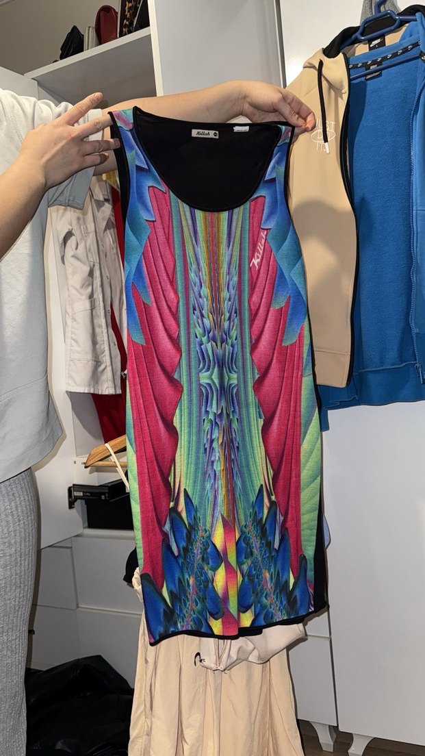 Renkli baskılı, kolsuz midi elbise, straplez yakalı ve drapeli tasarıma sahip, avangart stil için uygun.