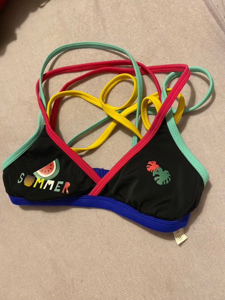 Renkli baskılı, fitted kesim bikini üstü, Velcro ile ayarlanabilir, plaj kullanımına uygun.