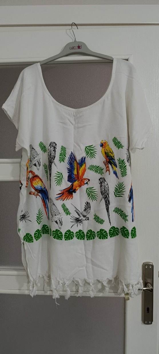 Renkli papağan ve yaprak baskılı, kısa kollu, bol kesim mini bohem pareo. Günlük kullanım için uygun ve rahat bir stil sunar.