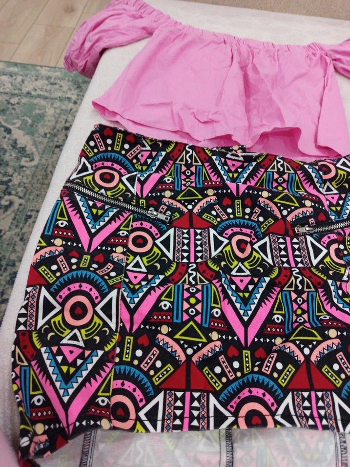 Renkli baskılı, mini kesim eteği, volan detaylıdır. Bohem ve pop kültür tarzında, günlük kullanıma uygundur.