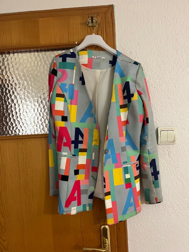 Kısa kesim ve regular fit olan bu kadın blazer, yakalı ve uzun kolludur. Sentetik kumaştan, renkli baskılı ve sokak tarzı tasarıma sahip, günlük kullanım için uygundur.